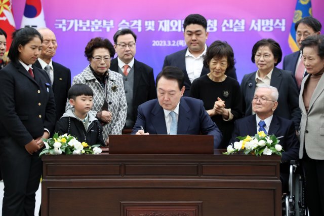 윤 대통령은 이날 용산 대통령실에서 보훈부 승격과 재외동포청 신설을 골자로 하는 정부조직법 공포안에 서명했다. 국가유공자와 유족 등 20여 명이 단상에서 윤 대통령을 둘러싼 채 서명을 지켜봤다. 윤 대통령은 ‘보훈문화는 곧 국격입니다. 승격을 축하합니다’라는 메시지를 남겼다.