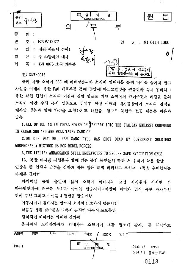 영화 ‘모가디슈’로도 제작됐던 지난 1991년 남·북한 외교관들의 소말리아 탈출기의 ‘실화’가 30년 만에 공개된 외교문서로 생생하게 확인됐다.