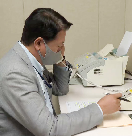 통일부 남북공동연락사무소에서 관계자가 통신연락선을 통해 북측과 통화를 하는 모습. 2021.10.4 통일부 제공
