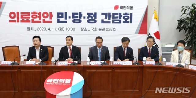 간담회는 앞서 지난 9일 고위 당정 협의회 결정에 따라 마련됐다. 고위 당정은 야권 주도로 본회의 직회부가 결정된 간호법 제정안과 의료법 개정안에 대해 재의요구권(거부권) 행사를 요청하지 않고 중재안을 마련해 설득하겠다고 결정했다.