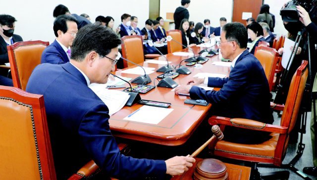 국회 기획재정위원회 경제재정소위원회 신동근 위원장이 12일 오전 국회에서 열린 소위 회의에서 의사봉을 두드리고 있다. 신 위원장은 더불어민주당 소속이다. 뉴스1