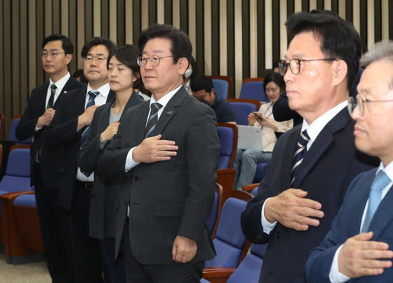 이재명 더불어민주당 대표와 박광온 원내대표 및 최고위원들이 3일 서울 여의도 국회에서 열린 의원총회에서 국기에 경례를 하고 있다. 2023.5.3 뉴스1
