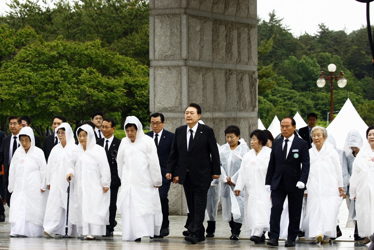윤석열 대통령은 18일 광주 국립 5·18민주묘지 정문인 ‘민주의 문’ 앞에서 5·18민주화운동 당시 가족을 잃은 어머니들의 모임인 ‘오월어머니회’ 회원 15명을 직접 맞았다. 주요 정부 인사들과 함께 입장하는 관례에서 벗어나 윤 대통령은 어머니들과 함께 ‘민주의 문’을 통과해 기념탑 앞 행사장까지 6분간 200m를 함께 걸었다. 현장엔 봄비가 내렸지만 검은색 정장 차림의 윤 대통령은 다른 참석자들처럼 우비나 우산을 쓰지 않았다.