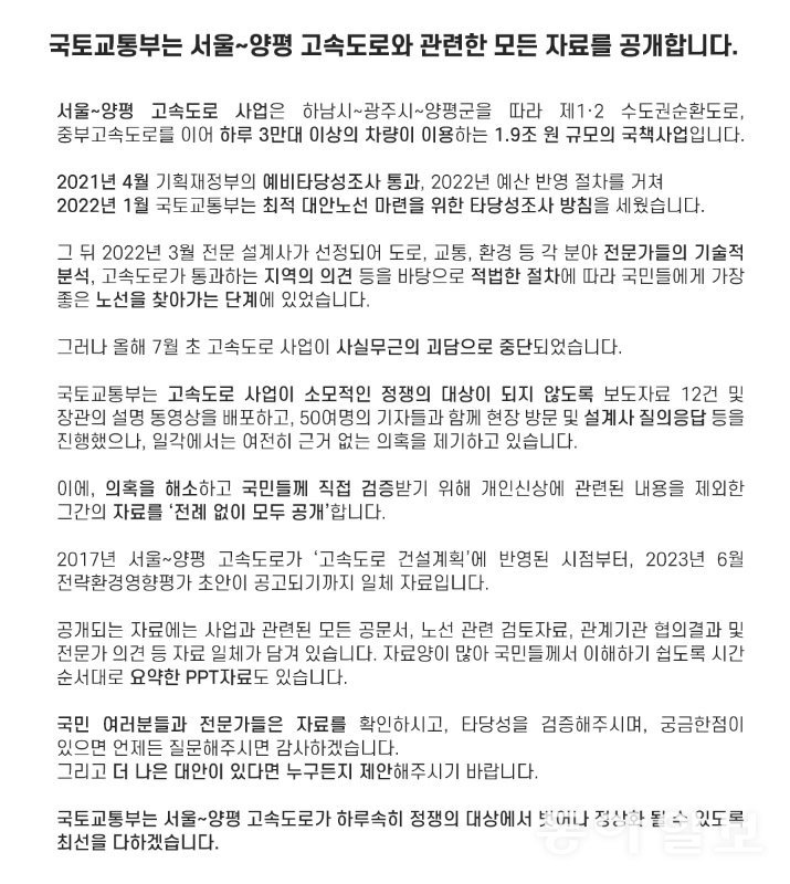 23일 국토부는 공식 홈페이지에 ‘서울~양평 고속도로 모든 자료 공개’라는 별도 페이지를 개설했다. 국토부는 “하루 3만 대 이상의 차량이 이용할 1조9000억 원 규모의 국책 사업이 이달 초 사실 무근의 괴담으로 중단됐다”며 “의혹을 해소하고 국민들께 직접 검증받기 위해 개인 신상 관련 내용을 제외한 그간의 자료를 ‘전례 없이 모두 공개’한다”고 밝혔다.