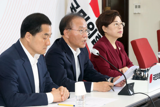 윤재옥 국민의힘 원내대표가 2일 오전 서울 여의도 국회에서 열린 무량판 공법 부실시공 관련 기자간담회에서 모두발언을 하고 있다. 2023.8.2/뉴스1
