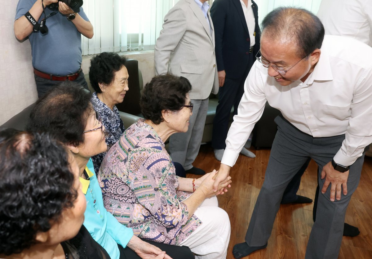 윤재옥 국민의힘 원내대표가 3일 서울 종로구 동원경로당 무더위쉼터를 방문해 폭염 대비 간담회 전 어르신들과 인사하고 있다. 사진공동취재단