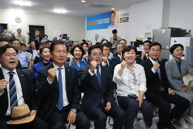 더불어민주당 진교훈 강서구청장 보궐선거 후보와 최고위원, 의원들이 11일 오후 서울 강서구 양천향교역 부근에 마련된 개표상황실에서 개표방송을 시청하며 초반 승기를 굳히자 환호하고 있다. 2023.10.11 사진공동취재단