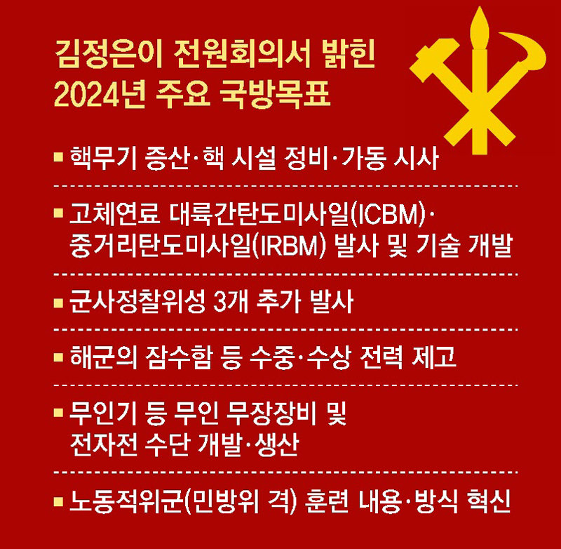 김 위원장은 핵무력 증강 노선을 내년에도 최우선 과업으로 이어가겠다며 7가지 국방과업까지 제시했다. 2024년도 핵무기생산계획 등 핵무기 생산을 지속적으로 확대할 토대 구축도 강조했다. 군 당국자는 “대남 공격용 전술핵 등 각종 미사일에 장착할 소형 핵탄두를 최대한 많이 제작하라고 지시한 것”이라고 분석했다.