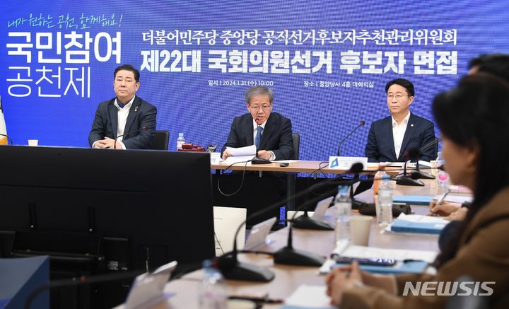 공관위는 5일 서울 여의도 중앙당사에서 경기·대구·부산 등 38개 지역구 공천 신청자를 대상으로 면접 심사를 진행했다. 이날 면접에는 홍익표 원내대표를 비롯한 당 지도부와 중진 의원들이 심사대에 올랐다.