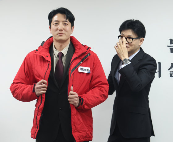 한동훈 국민의힘 비상대책위원장이 7일 서울 여의도 당사에서 열린 ‘국민인재 영입 환영식’에서 한정민 삼성전자 DS부문 연구원에게 국민의힘 옷을 선물하고 있다. 2024.2.7/뉴스1 ⓒ News1