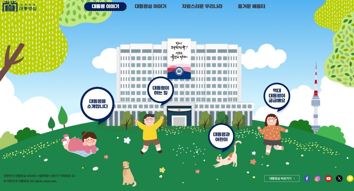 누리집은 ‘어린이를 아끼는 따뜻한 대통령이 전하는 대통령실’이라는 주제로 기획됐다. 누리집은 △대통령 이야기 △대통령실 이야기 △자랑스러운 우리나라 △즐거운 배움터 등 코너로 구성됐다.