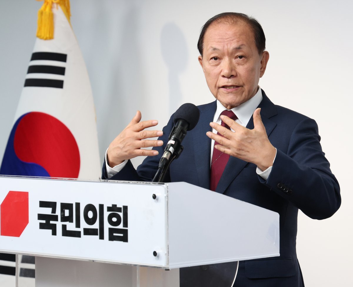 황우여 국민의힘 비상대책위원장이 3일 서울 여의도 중앙당사에서 열린 취임 입장발표 기자회견에서 취재진의 질문을 받고 있다. 2024.5.3. 뉴스1