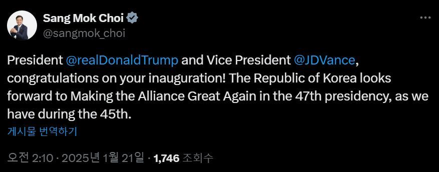 최 권한대행은 이날 자신의 엑스(X·옛 트위터)를 통해 트럼프 대통령과 JD밴스 부통령에게 “취임을 축하한다”고 밝혔다. 이어 “대한민국은 45대 때와 마찬가지로 47대 미국 대통령 임기에 동맹을 다시 위대하게(Making the Alliance Great Again) 만들기를 고대하고 있다”고 했다.