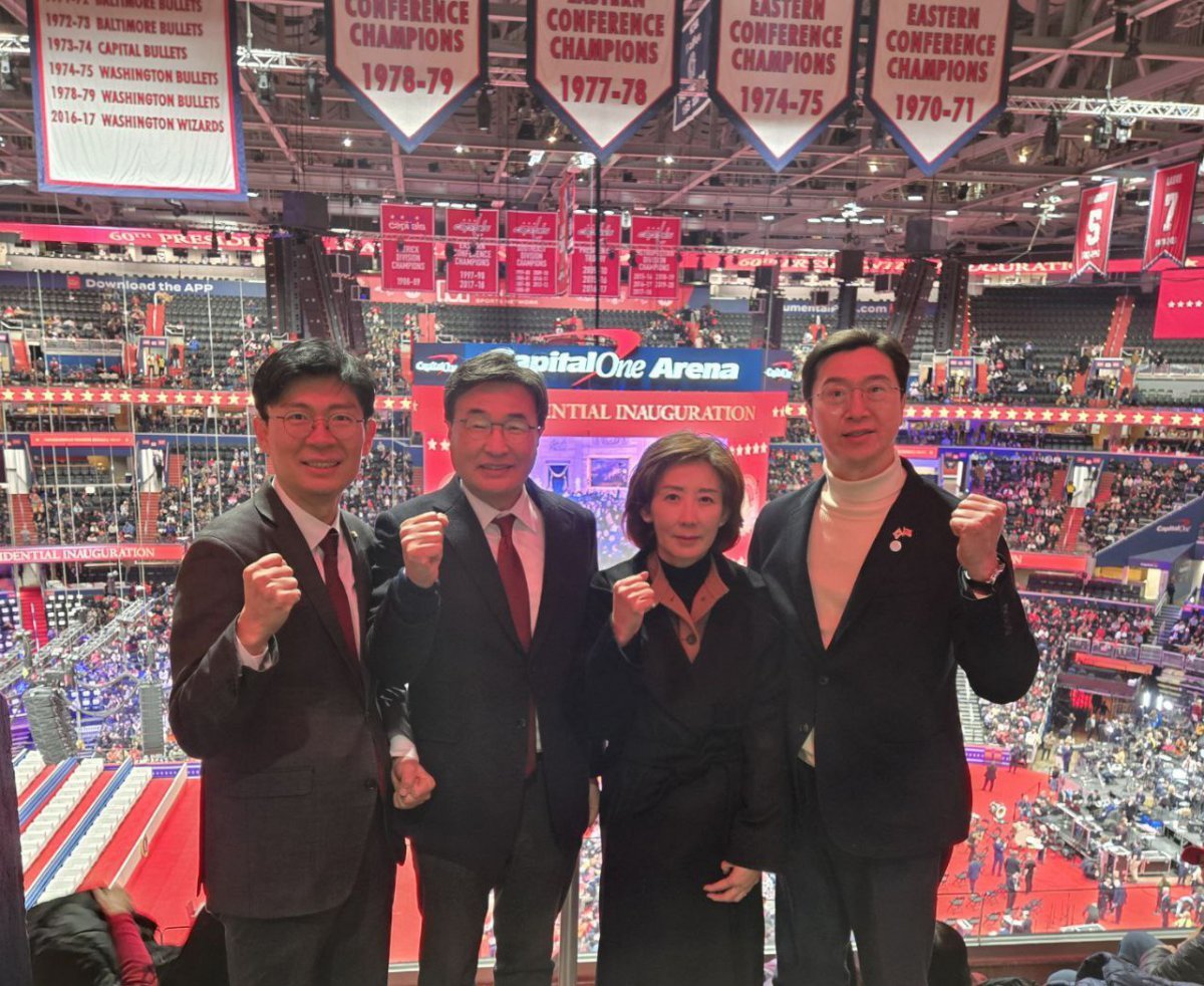 조정훈, 김대식, 나경원, 강민국 국민의힘 의원이 20일(현지시간) 미국 워싱턴DC 캐피털 원 아레나에서 열린 도널드 트럼프 대통령 취임식에 참석해 기념 촬영하고 있다. (조정훈 의원실 제공) 2025.1.20/뉴스1
