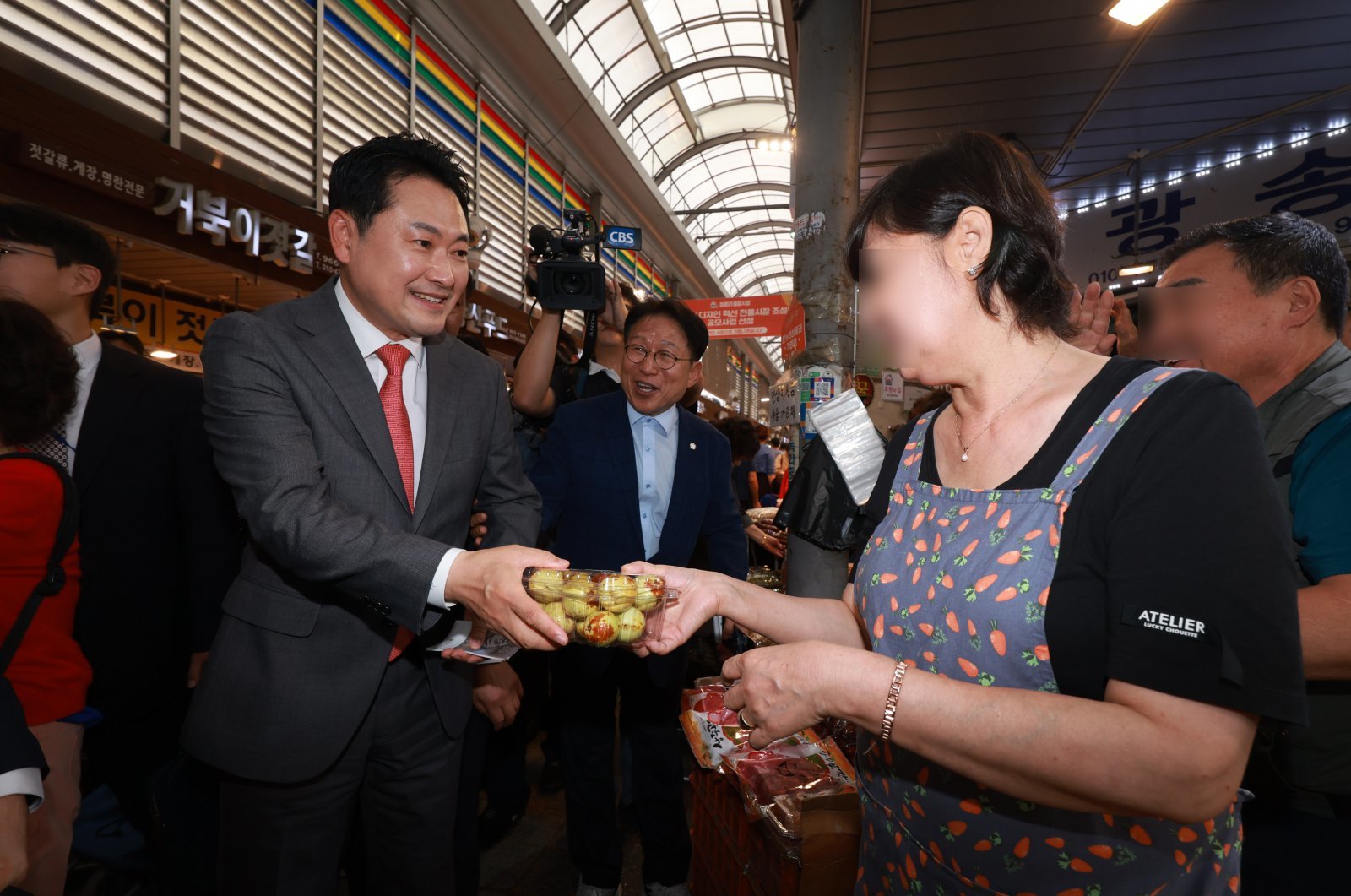 장동혁 국민의힘 대표가 2일 서울 경동시장을 찾아 추석 음식을 구매하고 있다. 2025.10.02. [서울=뉴시스]