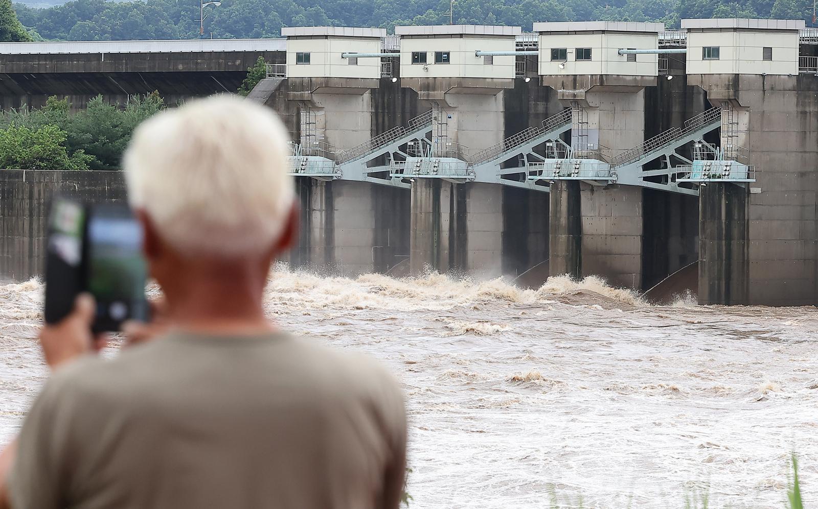 경기 북부 일대에 폭우가 내려 임진강과 한탕강 일대 곳곳에 홍수특보가 발령된 18일 오후 경기 연천군 군남댐에서 수문이 열려 많은 물이 방류되고 있다. 2024.7.18/뉴스1