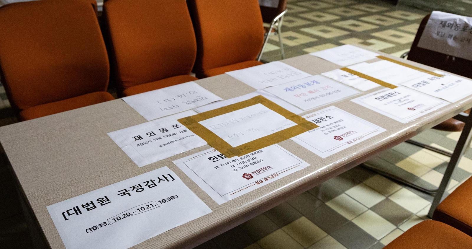 이재명 정부 첫 국회 국정감사를 하루 앞둔 12일 서울 여의도 국회 법제사법위원회 앞 대기 장소에 피감기관 직원들이 자리를 선점하기 위해 붙여 둔 종이에 기관명이 적혀 있다. 뉴스1