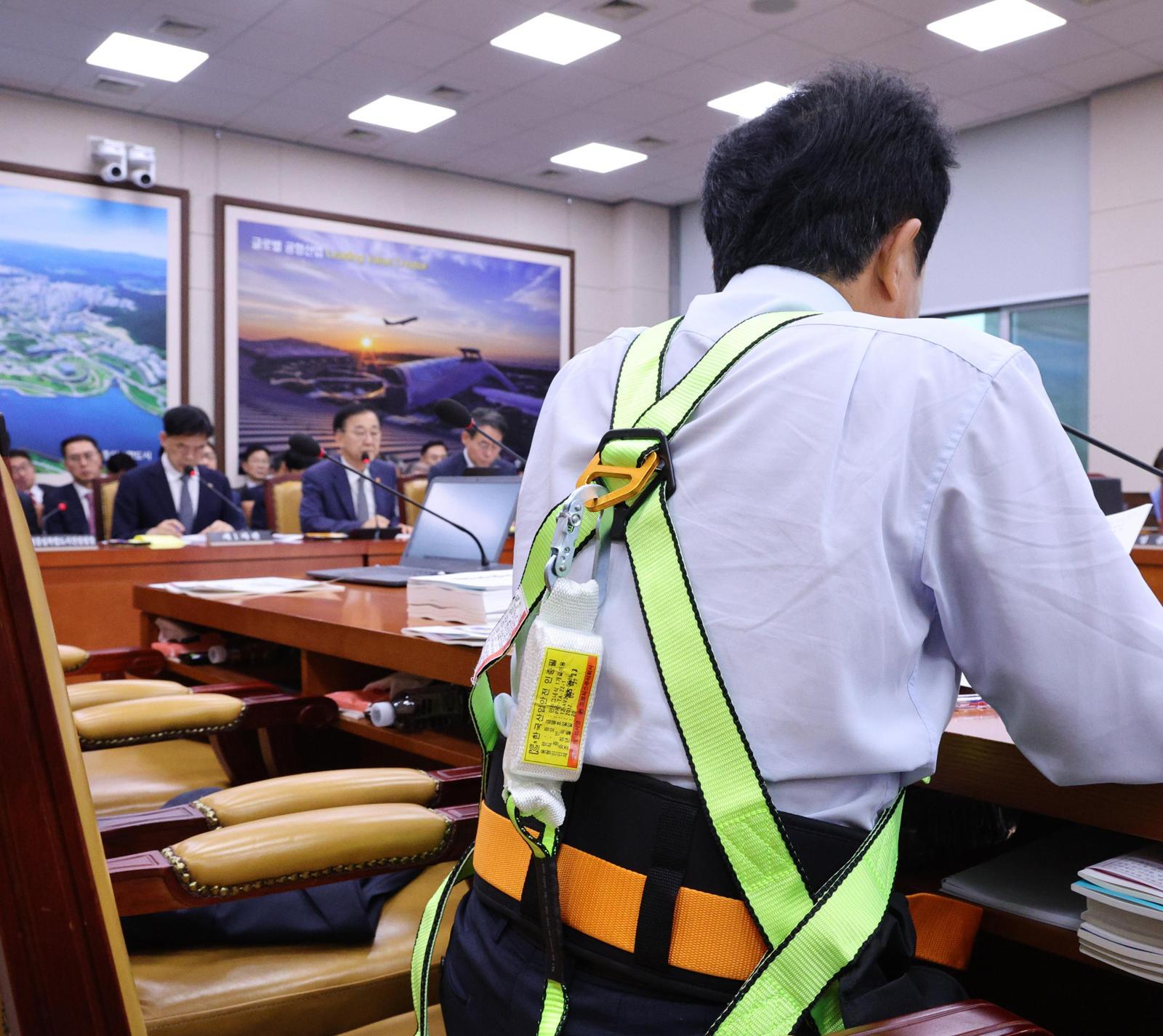 13일 국회 국토교통위원회에서 열린 국토교통부 국정감사에서 윤종오 진보당 의원이 현장노동자가 사용하는 안전벨트를 착용하고 질의하고 있다. 윤 의원은 정규직과 비정규직이 사용하는 안전화, 안전벨트 등 건설 현장 안전용품이 다르다는 점을 지적하며 “누구라도 제대로 된 안전장비를 지급받을 수 있도록 대책을 마련해야 한다”고 주장했다.