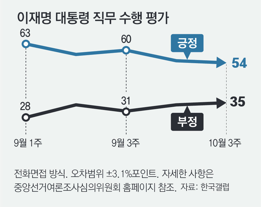 이 대통령의 국정 지지율인 직무 긍정 평가는 54%로 이재명 정부 출범 이후 가장 낮았다. 부정 평가는 35%였다. 역대 최고치였던 8월 3주 조사와 동률이다. 긍정 평가 이유는 경제·민생(16%)이 가장 높았고, 외교(15%)가 그 다음이었다. 부정 평가 이유는 외교(18%)가 가장 높았고, 친중 정책·중국인 무비자 입국(8%)이 뒤를 이었다. 부동산 정책·대출 규제는 5%였다.
