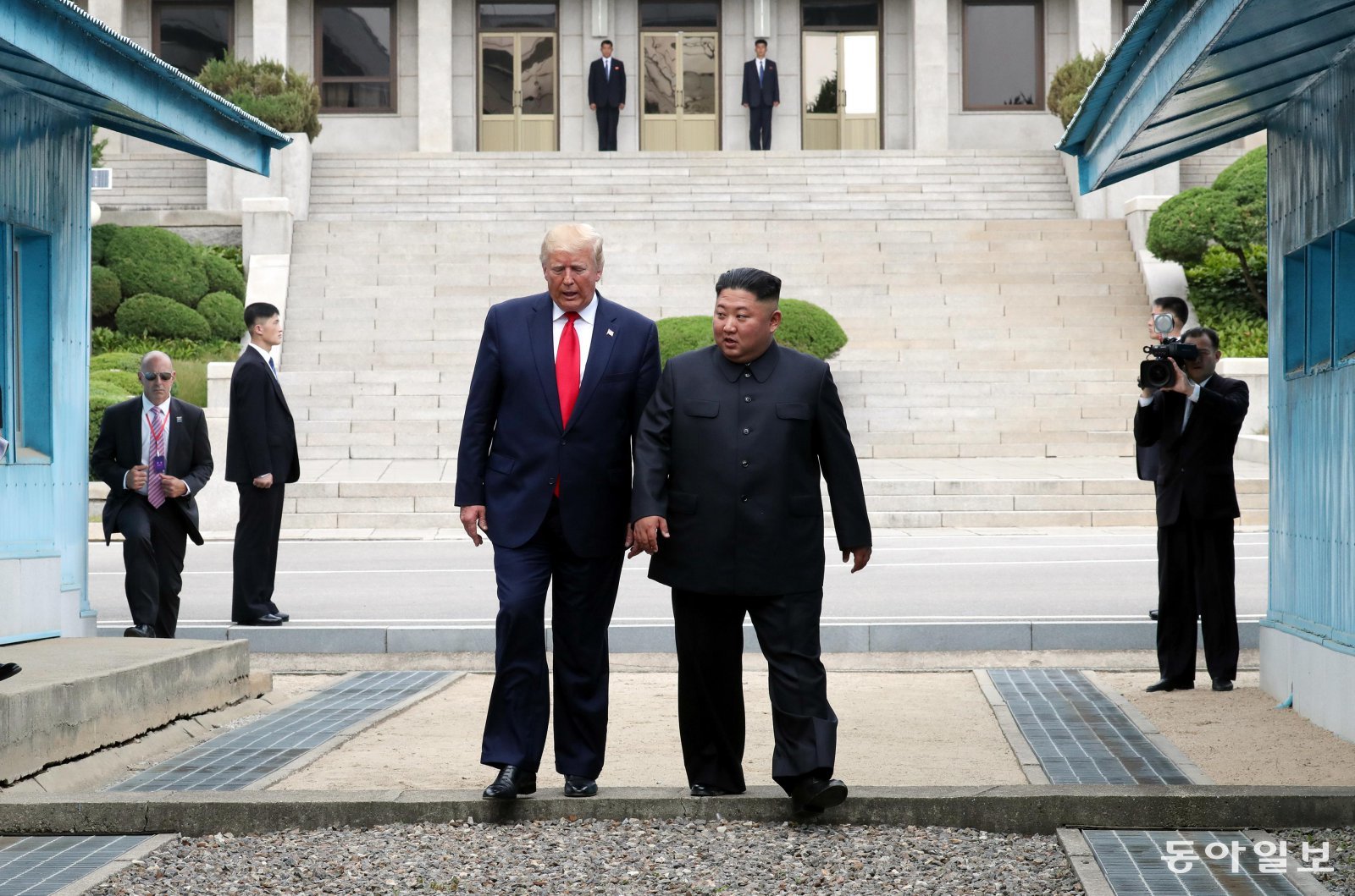 도널드 트럼프 미국 대통령(왼쪽)이 2019년 6월 30일 김정은 북한 국무위원장과 만나 군사분계선을 넘어 북측으로 갔다가 다시 김 위원장과 함께 남측으로 넘어오고 있다. 당시 트럼프 대통령은 일본에서 주요 20개국(G20) 정상회의를 마친 뒤 6월 29일 오전 방한하기 직전 트위터에 “김 위원장이 이것을 본다면 비무장지대(DMZ)에서 그를 만나 악수를 나누고 인사를 할 수 있을 것”이라고 밝혔다. 트럼프 대통령의 즉흥적인 제안 32시간 만에 남북미 판문점 회동이 성사됐다.