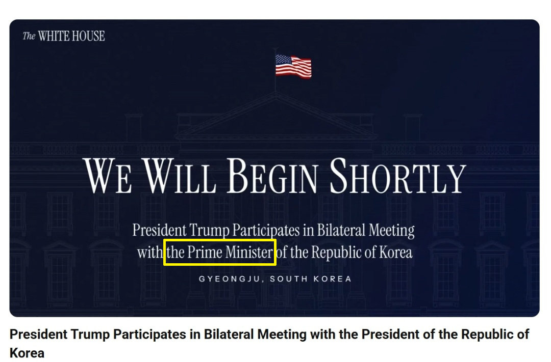 백악관이 29일 한미 정상회담 생중계 영상을 내보내면서 한국 대통령을 ‘총리’라고 오기한 것으로 나타났다.