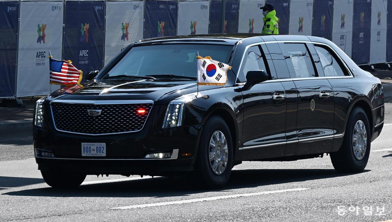 29일 김해국제공항으로 입국한 도널드 트럼프 미국 대통령이 아시아태평양경제협력체(APEC) 최고경영자(CEO) 서밋 특별연설을 하기 위해 전용 리무진인 ‘더 비스트’를 타고 이동하고 있다. 경주=홍진환 기자 jean@donga.com
