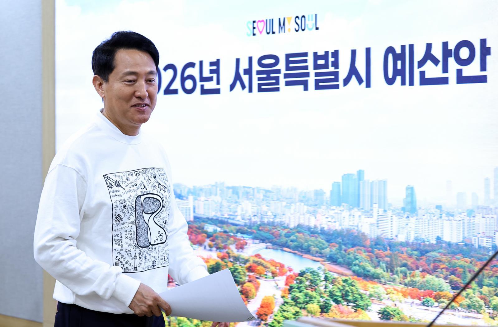 오세훈 서울시장이 30일 서울 중구 서울시청에서 2026년 서울특별시 예산안 관련 브리핑을 위해 입장하고 있다. 뉴시스