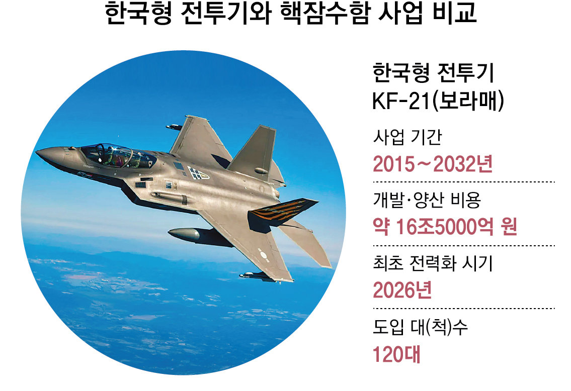 핵잠수함 확보는 한국형 전투기 KF-21(보라매) 사업(약 16조5000억 원)을 넘어 역대 최대 규모의 무기 도입 사업이 될 것이라는 관측이 지배적이다. 4∼6척의 건조 비용만 12조∼18조 원이 투입되고, 개발 비용까지 포함하면 총 비용이 20조 원을 훌쩍 넘을 수 있다는 관측도 나온다.