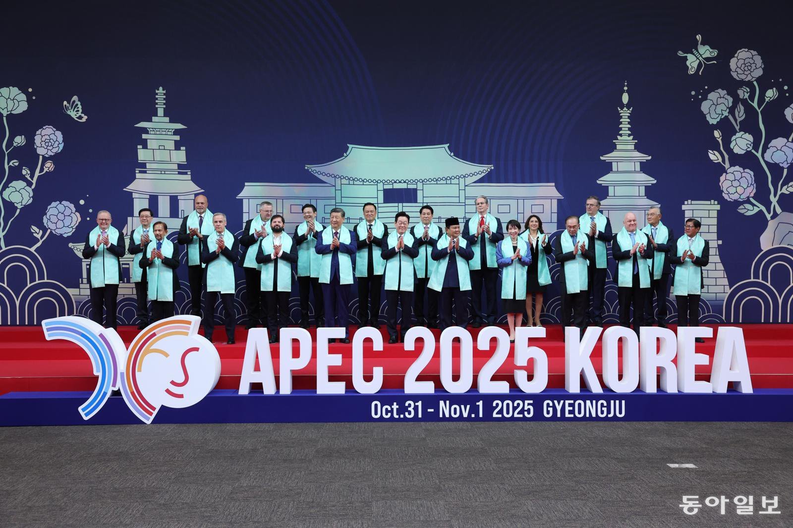 이재명 대통령이 1일 경북 경주화백컨벤션센터에서 APEC 정상회의에 참석한 각국 정상들과 전통한복 목도리를 하고 단체 기념촬영을 하고 있다. 목도리에는 APEC 정상회의 엠블럼과 한글 자음 모음이 금박으로 새겨져 있다. 앞줄 오른쪽부터 페르디난드 마르코스 필리핀 대통령, 크리스토퍼 럭슨 뉴질랜드 총리, 안와르 이브라힘 말레이시아 총리, 다카이치 사나에 일본 총리, 프라보 수비안토 인도네시아 대통령, 이재명 대통령, 시진핑 중국 국가주석, 가브리엘 보리치 칠레 대통령, 마크 카니 캐나다 총리, 하사날 볼키아 브루나이 국왕, 앤서니 앨버니지 호주 총리, 뒷줄 오른쪽부터 린신이 대만 타이와니아 캐피털 회장, 마르셀로 루이스 에브라르드 카사우본 멕시코 경제부 장관, 테레사 메라 고메스 페루 통상관광부 장관, 스콧 베센트 미국 재무부 장관, 르엉 끄엉 베트남 국가주석, 아누틴 찬위라꾼 태국 총리, 로런스 웡 싱가포르 총리, 알렉세이 오베르축 러시아 부총리, 존 로쏘 파푸아뉴기니 부총리, 존리 홍콩 행정장관. 경주=송은석 기자 silverstone@donga.com