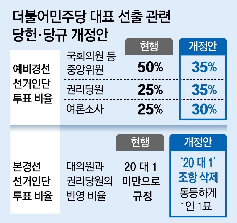 개정안은 당 대표 선거에 4명 이상 출마 시 치러지는 예비경선에서 중앙위원 50%, 권리당원 25%, 국민여론조사 25%를 반영하는 현행 당규를 중앙위원 35%, 권리당원 35%, 여론조사 30%로 바꾸는 안을 담고 있다. 현역 의원과 당 지도부, 시도당위원장 등으로 구성된 중앙위원의 표심을 15%포인트 낮추는 대신에 권리당원 표심을 10%포인트, 여론조사를 5%포인트 높인 것.