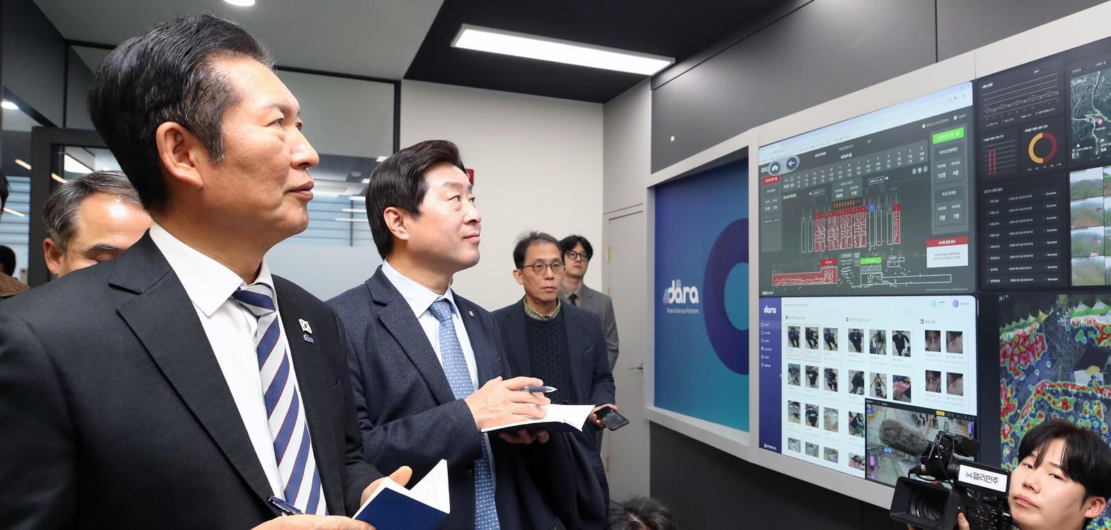 더불어민주당 정청래 대표(왼쪽)가 19일 대구 수성구 수성알파시티에 위치한 인공지능(AI) 기업 스피어AX의 융복합관제센터에서 AI 기반 지능형 폐쇄회로(CC)TV에 대한 설명을 듣고 있다. 대구=뉴스1