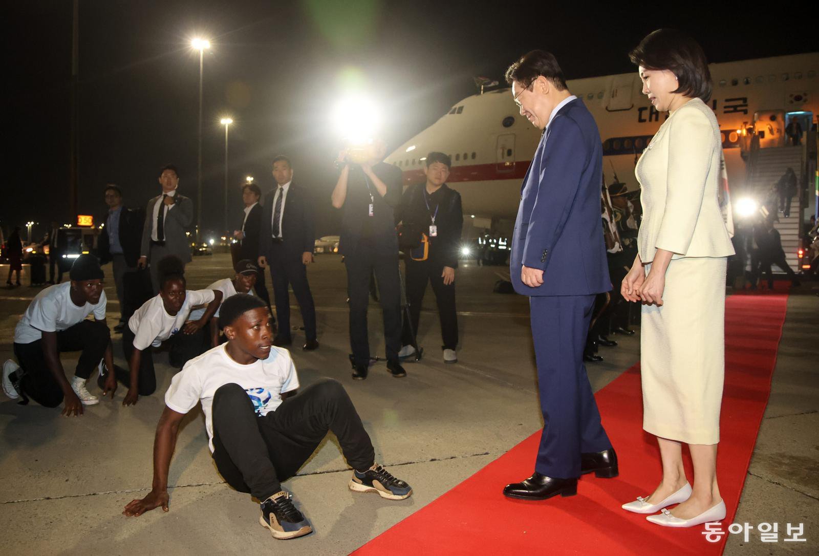 21일 밤 요하네스버그 O.R. 탐보 국제공항에 도착한 이 대통령 부부는 공군 1호기에서 내려 의장대가 도열한 레드카펫을 걸었다. 레드카펫 끝에선 청소년 8명으로 구성된 ‘댄싱 크루’가 격렬하게 춤을 추며 이 대통령 부부의 눈길을 사로잡았다. 김혜경 여사는 갑작스런 기합 소리에 깜짝 놀란 듯한 제스처를 보였으나, 이내 환하게 웃으며 이들의 공연을 지켜봤다. 이 대통령도 미소를 띤 채 박수를 치며 호응했다.