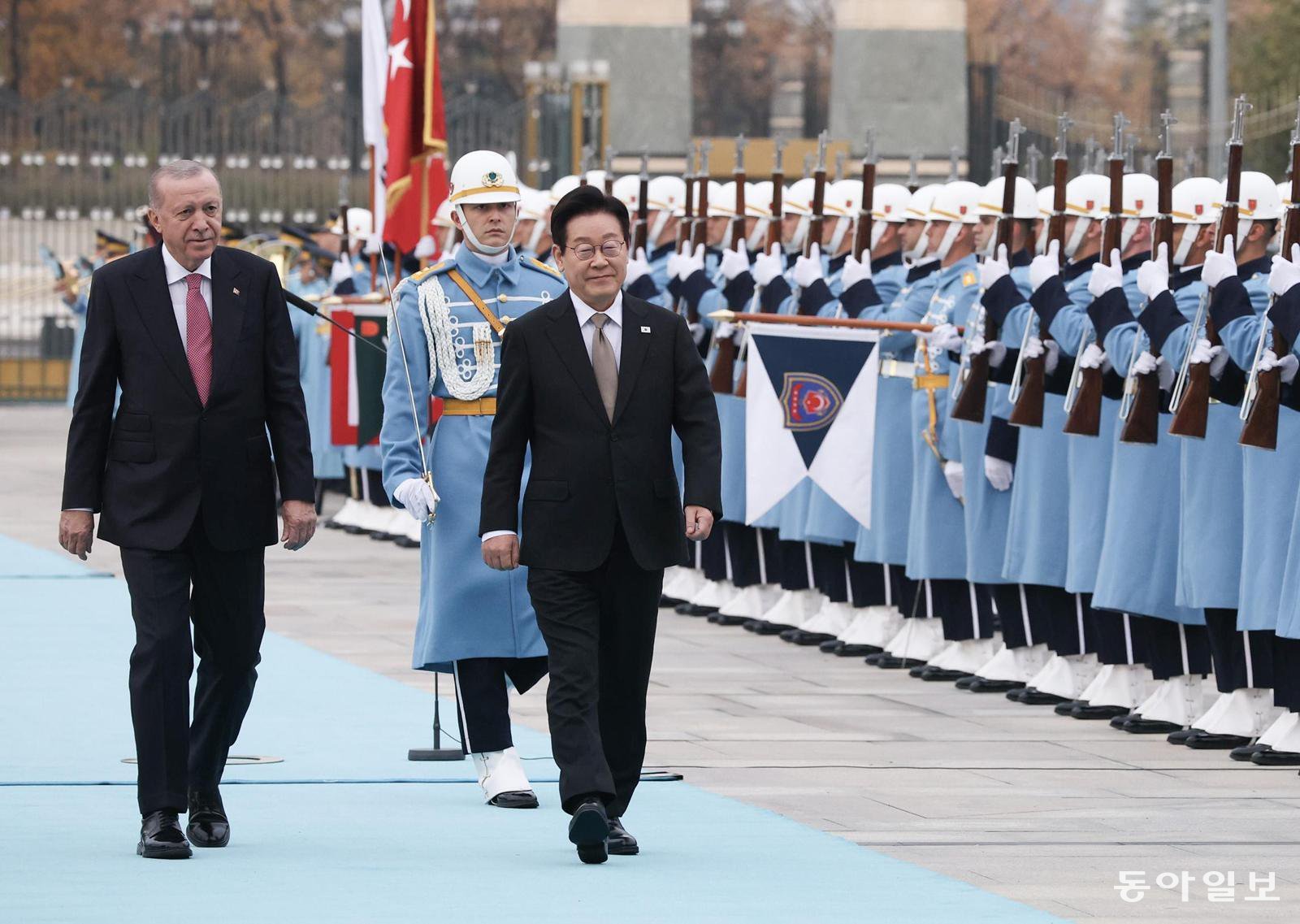 튀르키예를 국빈 방문한 이재명 대통령이 24일(현지 시간) 튀르키예 대통령궁 광장에서 열린 공식환영식에서 레제프 타이이프 에르도안 대통령과 의장대를 사열하고 있다. 앙카라=송은석 기자 silverstone@donga.com