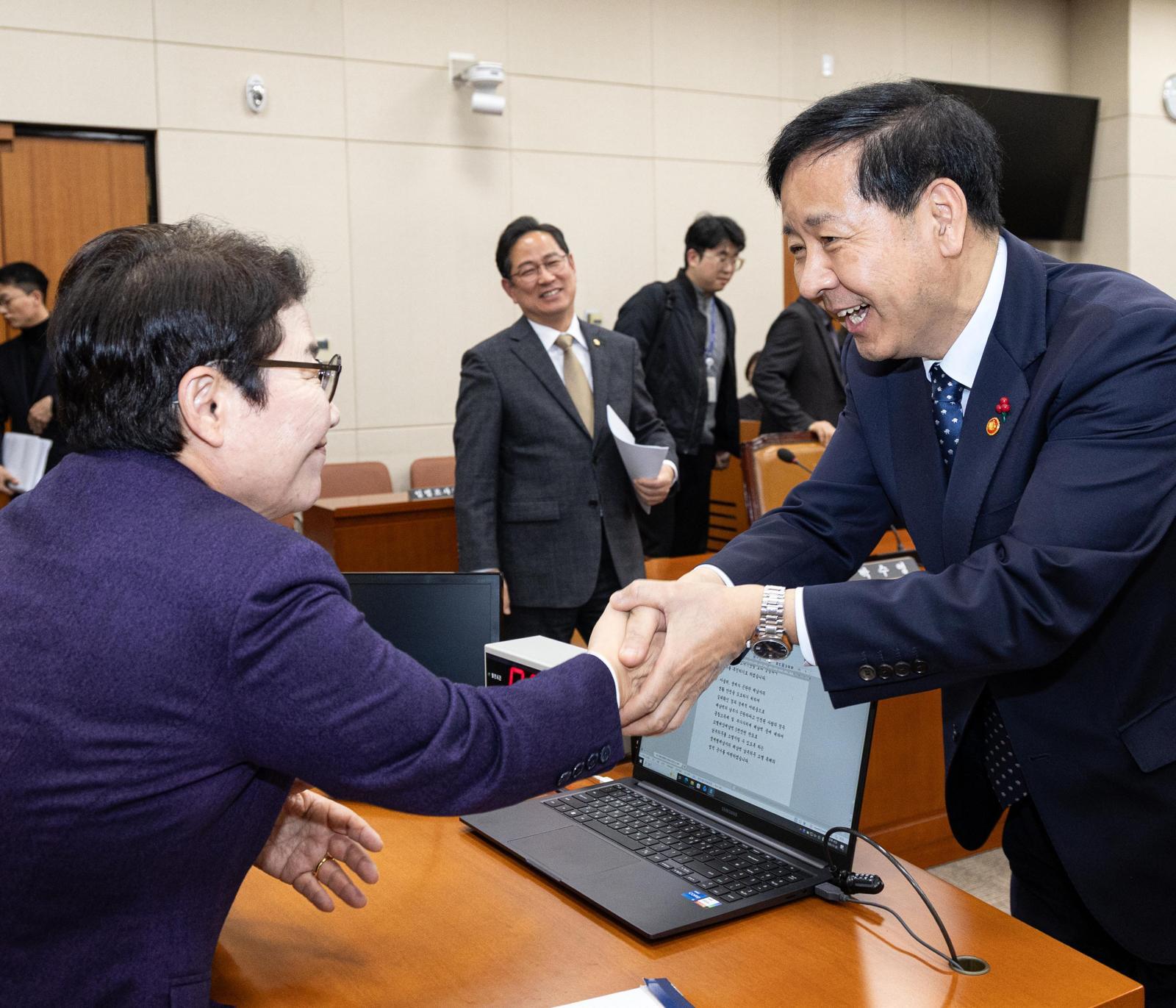 30일 서울 여의도 국회에서 열린 기획재정위원회 전체회의가 산회한 이후 구윤철 부총리 겸 기획재정부 장관(오른쪽)이 국민의힘 소속인 임이자 기재위원장과 악수하고 있다. 이날 여야가 내년도 예산안 합의에 실패해 정부 예산안과 법인세 인상안 등이 본회의에 자동 부의됐다. 뉴스1