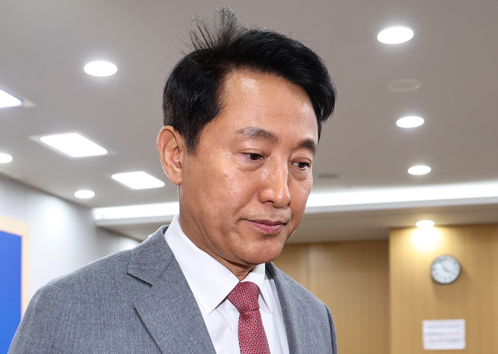 오세훈 서울시장이 1일 오후 서울시청에서 김건희 특검이 오 시장을 ‘명태균 여론조사비’ 대납 혐의로 기소한 것과 관련해 입장을 밝힌 뒤 브리핑실을 나서고 있다. 2025.12.1 뉴스1