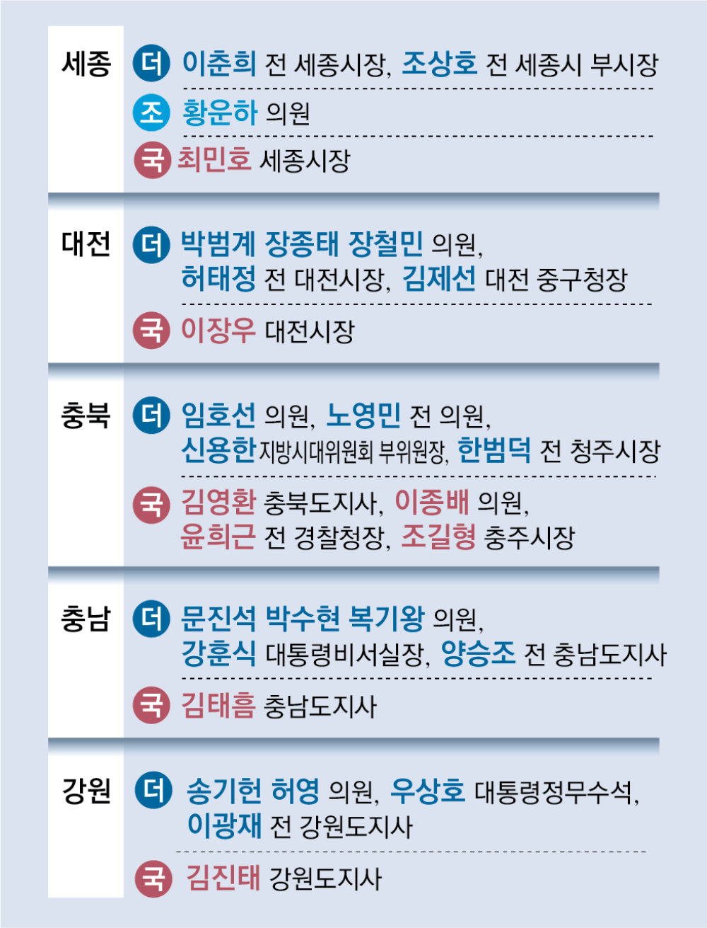 제주에선 오영훈 제주도지사를 상대로 민주당 소속 3선의 위성곤 의원과 초선의 문대림 의원 등의 출마 가능성이 점쳐진다. 국민의힘에선 문성유 전 캠코 사장과 장성철 전 제주도당위원장, 김승욱 제주을 당협위원장 등이 출마를 저울질 중인 것으로 전해졌다.