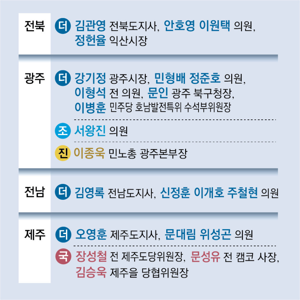 더불어민주당이 강세인 광주에서는 강기정 광주시장과 광주 유일 재선 의원인 민형배 의원의 양강 구도가 형성돼 있다. 초선의 정준호 의원과 문인 광주 북구청장, 이병훈 당 호남발전특위 수석부위원장, 이형석 전 의원 등도 후보군이다. 조국혁신당에서는 광주가 고향인 서왕진 원내대표의 출마 가능성이 점쳐진다.