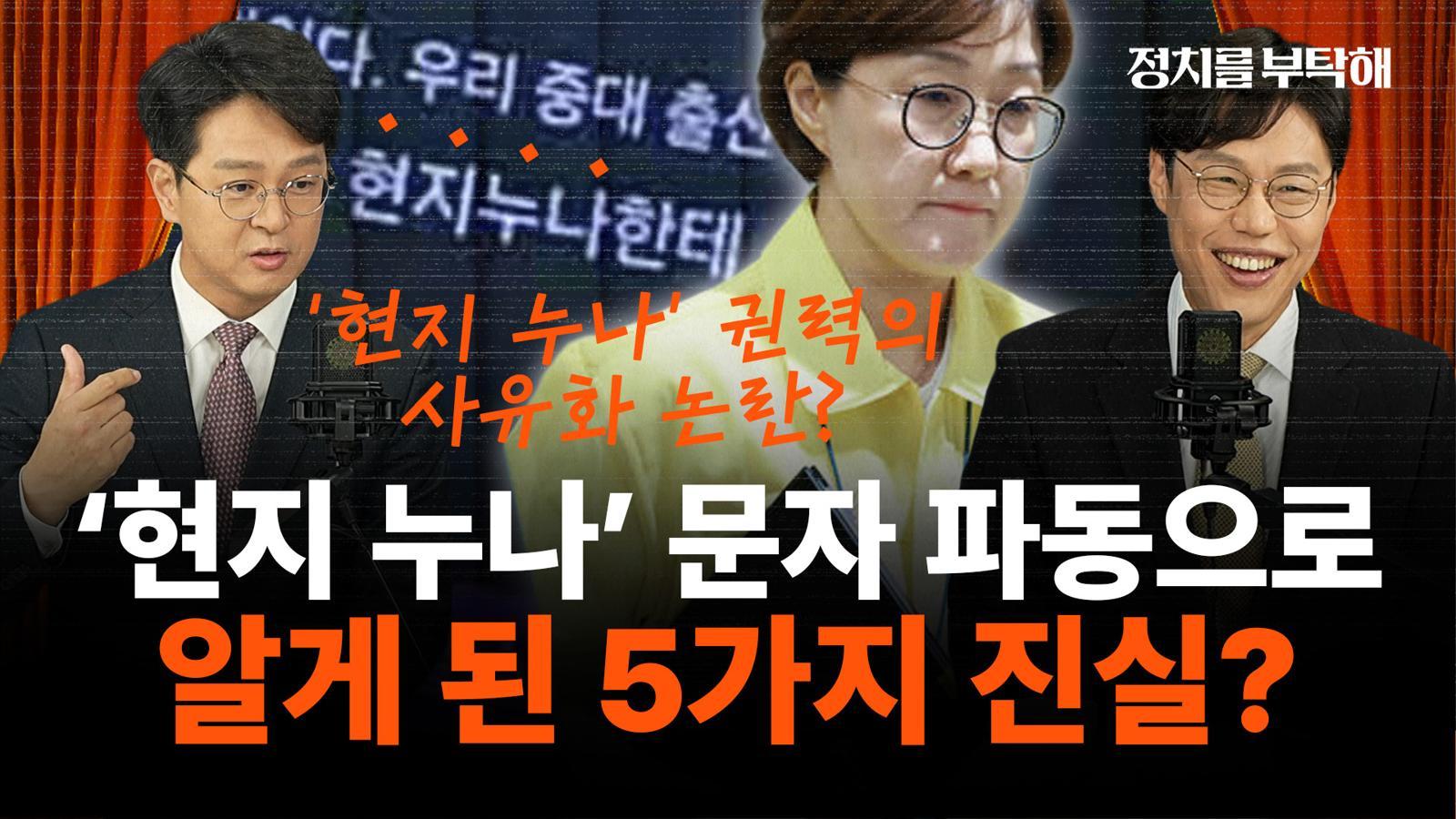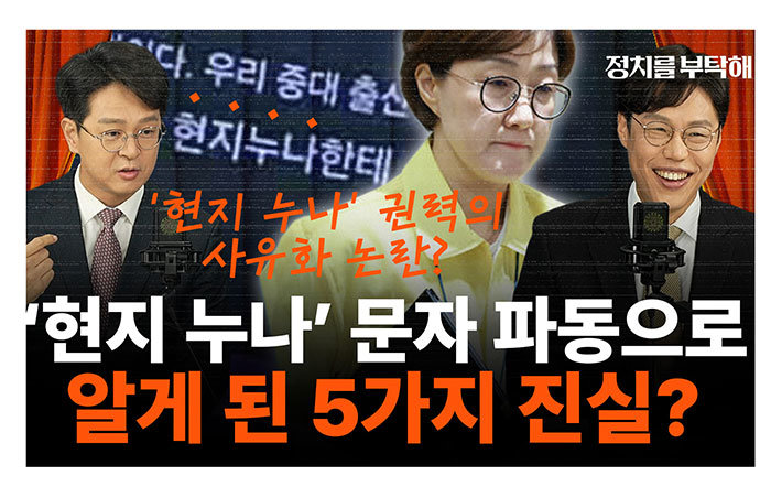 ▶ 정광재: 그 얘기하니까 지난 2016년 17년에 국정농단 탄핵까지 이어졌잖아요. 그때 당시 청와대 인사들이 했던 그 만시지탄이 뭐였는지 아세요? 차라리 최순실을 부속실장으로 임명해서 공식 라인에 뒀었으면 비선실세 이름은 안 들었을 것 아니냐 그러면 탄핵까지 이를 거 아닌데라는 자조 섞인 얘기를 했었는데 지금 김현지 실장은 딱 그런 거죠. 어떤 직위를 갖고 있어서 얘기를 하는 것이 뭐 비선 실세는 아니지 않냐 이렇게 빠져나갈 구멍이 있는 것 같아요. 저는 이번 문자 메시지 노출과 관련해 갖고 왜 이렇게 그럼 빨리빨리 뭐가 좀 수습되는 듯한 모습 보였느냐 정치적 파괴력이 있었다고 생각해요. 어떤 데에서 정치적 파괴력이 있었느냐 현지 누나 이 네 글자 현지 누나 이 한마디에 그냥 와 여기는 형 동생끼리 그냥 알아서 해 먹는구나 권력의 사유화를 윤석열 정부 때 그렇게 비판하더니 알고 보니 자기네들끼리 권력을 사유화하고 있구나 김현지 실장이나 뭐 지금 얘기했던 거 나중에 얘기할지 모르지만 이준석 개혁신당 대표가 김대중으로 요약했던 것 같습니다. 김현지 실장 대장동 변호사 그리고 중앙대 출신 이런 식으로 본인들이 빛의 혁명을 통해서 대한민국 국민 주권 시대를 복원했다고 이렇게 자랑하더니 국민주권 시대가 아니라 김대중 주권 시대였구나 이런 식으로 해석할 수 있는 거잖아요. 저는 이 뭐 훈식이형 이거는 뭐 그냥 뭐 사람들 신경도 안 쓰는 것 같아요. 그러나 현지 누나 이 네 글자로 인해서 대통령실이 발칵 뒤집혔던 거 아닌가 이렇게 생각해 볼 수 있고 사실 우리도 언론사 있을 때 조금 친하지만 형님 동생 하지 않습니까? 그런데 그게 어느 정도 좀 공적 단계로 분화하게 되면 다 그분의 공식 직함을 이야기하게 돼요. 그렇죠 저도 그 대변인 되기 전에 우리나라 당에 있는 뭐 6선 의원이건 뭐 국회 부의장이시고 형님 그랬어요. 다 그러나 제가 이 안에 조직으로 들어오게 되는 순간 다 대표님 뭐 의장님 이런 식으로 변하는 건데 이런 공직에 가서도 또 위계가 있는 자리에 가서도 형님 동생 하는 건 문제가 있죠.