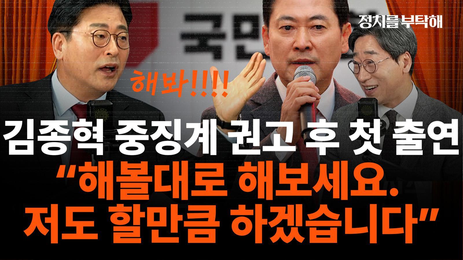 ▶ 김종혁: 저는 이호선 위원장이 얘기하는 정치적 입지를 강화하기 위해서 당을 희생양 삼았다라고 얘기하는데 그 비판은 장동혁 대표에게 돌아가야 된다고 생각합니다. 왜냐하면 장동혁 대표는 자신의 정치적 입지를 강화하기 위해서 당원들을 계속 장외로 끌어내고 있어요. 그리고 당원들에게 모두 몇 명 동원해 몇 명 동원해 해서 데려다가 계속 장외 집회를 했지만 그래서 어떻게 됐습니까? 언론으로부터 두드려 맞고 지지도는 전혀 올라가지 않고 있지 않습니까? 본인이 본인의 정치적 입지를 강화시키 위해서 당을 이용하고 당원들을 활용하고 있는 거 아닙니까? 저는 이호선 당무감사위원장한테 번지수를 잘못 찾으셨습니다. 그 비판은요 장동혁 대표한테 하셔야죠. 제가 정치적 입지를 강화? 아니 지금 다 쫓겨난 제가 무슨 정치적 입지를 강화할 게 뭐가 있습니까? 제가 보기에는 이 논리가 처음부터 끝까지 하나도 말의 이치에 닿지 않는 것이고 그리고 그런 주장을 계속하셔서 뭐 그 윤리위원장 얘기 들어보니까 윤리위원장을 또 굉장히 강성인 분을 또 임명을 하려고 한다 뭐 이름까지도 좀 나오던데 그런데 여론 때문에 못하고 있다는 얘기가 나오더라고요. 뭐 하실 대로 해보시는 거죠? 뭐 저는 닭의 목을 비튼다고 그래서 새벽에 안 우는 건 아닙니다. 그렇기 때문에 저는 대한민국의 민주주의가 뭐 이런 식의 강압적인 겁박에 의해서 좌초할 거라는 생각은 하지 않습니다. 그러니까 해 볼 대로 해 보십시오. 저도 할 만큼 하겠습니다.