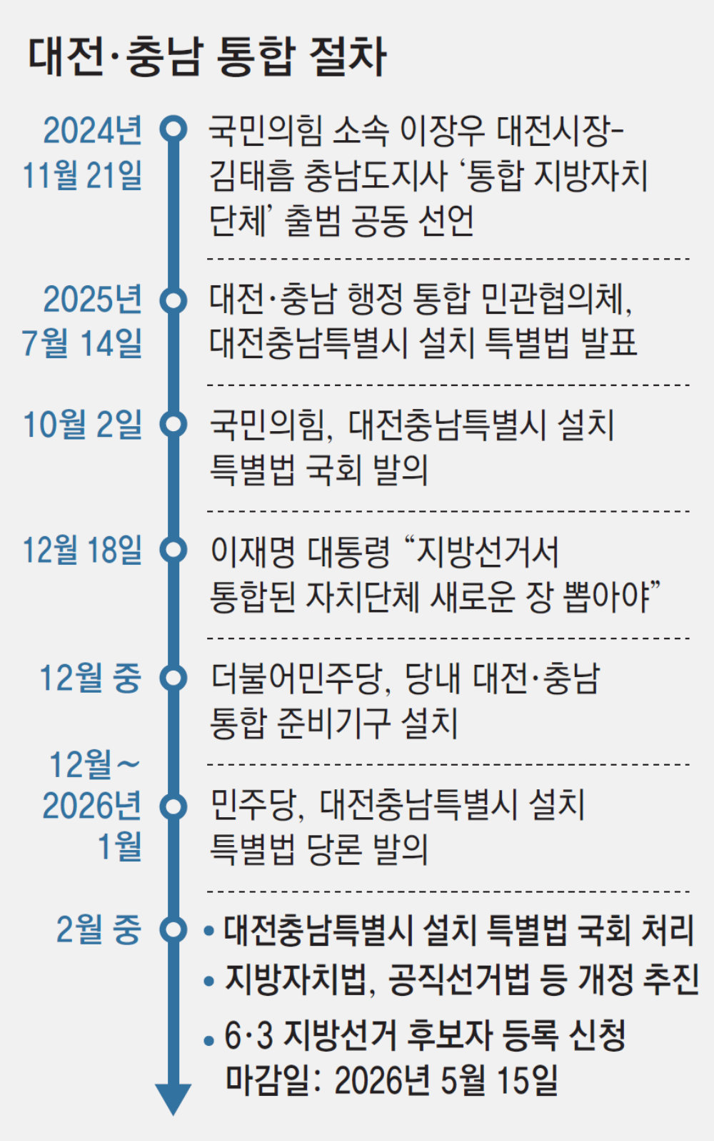 대전·충남 통합은 지난해 11월 국민의힘 소속인 이장우 대전시장과 김태흠 충남도지사의 행정 통합 선언 이후 올 10월 국민의힘 의원 45명이 ‘대전충남특별시 설치 특별법’을 발의하는 등 야당이 주도해 왔다. 민주당 의원들은 국민의힘 주도의 행정 통합에 반대해 왔다.