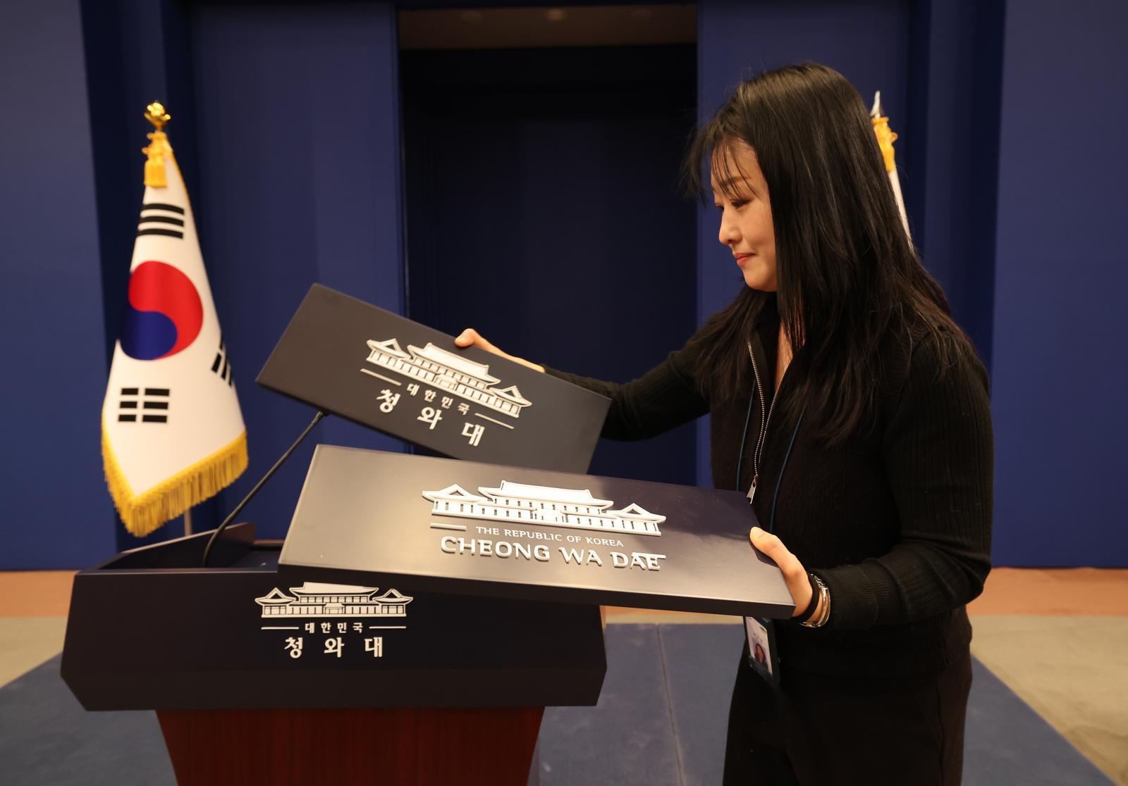 대통령실 직원이 21일 청와대 춘추관 브리핑룸에서 탈부착 업무 표장을 점검하고 있다. 대통령실의 청와대 복귀가 이달 말 마무리되면 이재명 대통령과 3실장(비서실장, 정책실장, 국가안보실장)은 여민관의 한 건물에서 함께 일하게 된다. 대통령실 공식 명칭도 ‘청와대’로 환원된다.