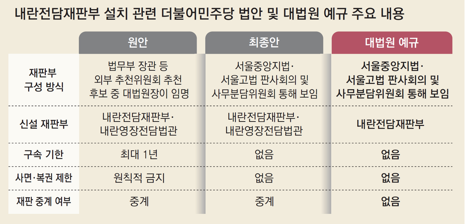 결국 민주당이 상정한 최종안은 내란사건 관련 영장심사를 전담할 영장법관을 별도로 두도록 한 것과 원칙적으로 재판을 중계하도록 한 조항 등을 제외하면 사실상 대법원 예규와 같은 내용이라는 지적이다. 내란범에 대한 사면·복권을 제한하고 구속 기간을 기존의 두 배인 1년으로 연장하는 내용 역시 위헌 논란 속에 최종안에서는 모두 빠졌다.