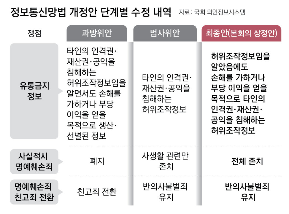 개정안은 정보통신망을 통한 유통금지 대상에 허위정보와 조작정보 개념을 신설해 추가했다. 내용 전부 또는 일부가 허위면 ‘허위정보’, 사실로 오인하도록 변형된 정보면 ‘조작정보’라는 것.