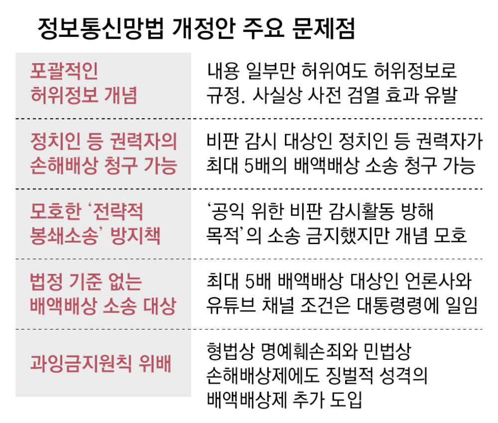더불어민주당이 23일 허위조작정보근절법(정보통신망법 개정안)을 국회 본회의에 상정하며 강행 처리 수순에 들어간 가운데 정보통신망법 개정안을 둘러싼 위헌 논란이 확산되고 있다. 일부 사실관계만 잘못돼도 허위 정보로 규정하는 등 규제 대상이 지나치게 넓다는 것. 또 조국혁신당 등이 요구했던 정치인과 고위공직자, 기업인 등 이른바 ‘권력자’의 손해배상 청구권을 제외하는 내용은 끝내 반영되지 않으면서 불리한 보도를 막기 위한 소송 남발을 막을 장치도 부족하다는 지적이 나온다. 이 때문에 국민의힘은 물론이고 일부 친여 단체들에서도 “언론의 비판 감시 기능을 위축시키고 표현의 자유를 침해할 위험이 훨씬 크다”는 비판이 나오고 있다.