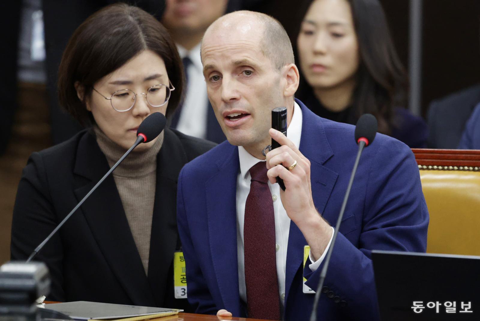 해롤드 로저스 쿠팡 임시대표가 30일 서울 여의도 국회에서 열린 제430회국회 쿠팡 침해사고 및 개인정보 유출, 불공정 거래, 노동환경 실태 파악과 재발방지 대책 마련을 위한 연석 청문회에 출석해 동시통역기를 들고 최민희 과방위장에게 항의하고 있다. 박형기 기자 oneshot@donga.com