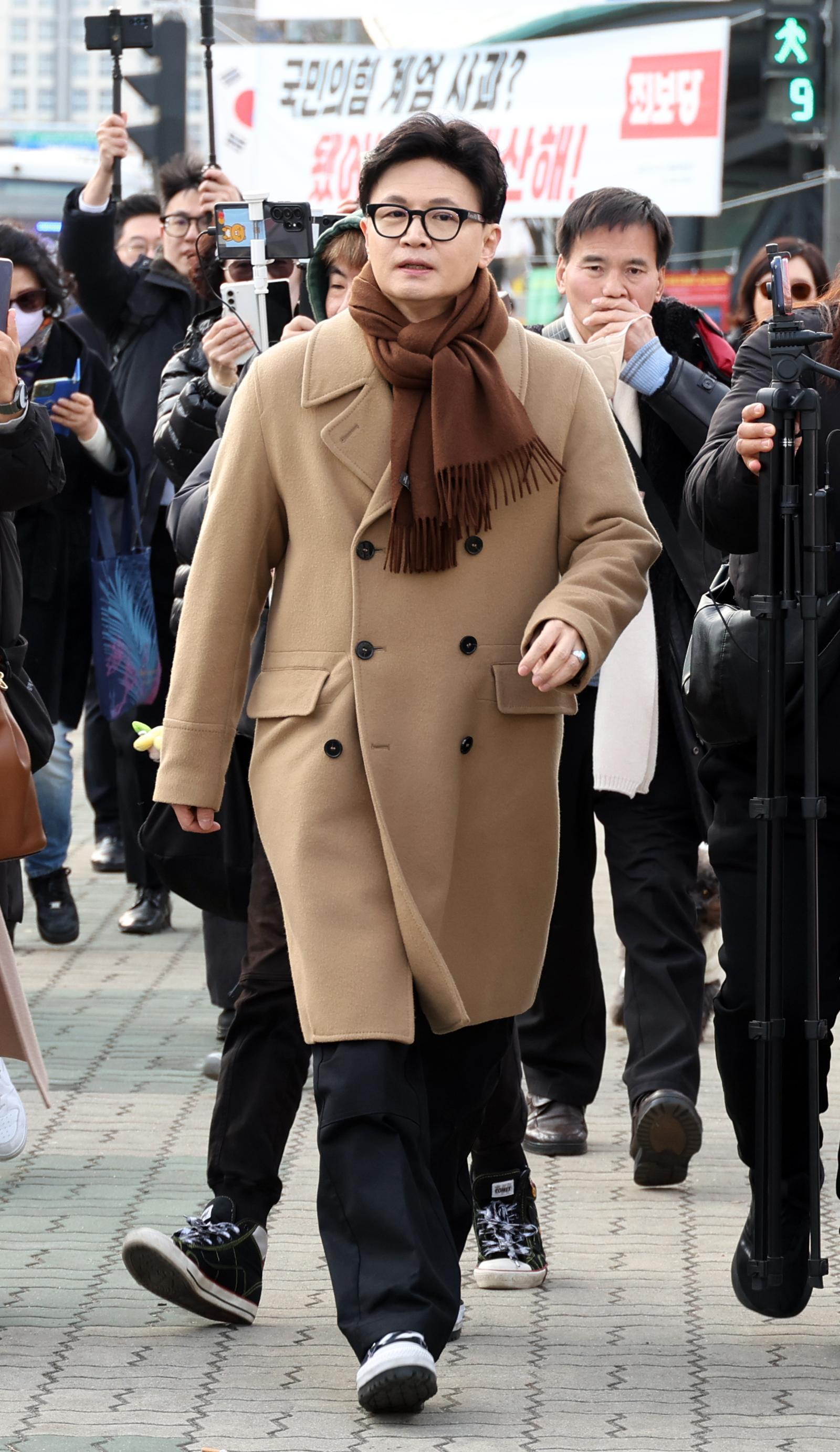 한동훈 국민의힘 전 대표가 9일 오후 서울 여의도 국회 앞에서 제2연평해전 영웅 고 한상국 상사 아내 김한나 씨의 지연성 PTSD 법 입법 촉구 1인 시위에 동참하고 있다. 2025.12.09. 뉴시스