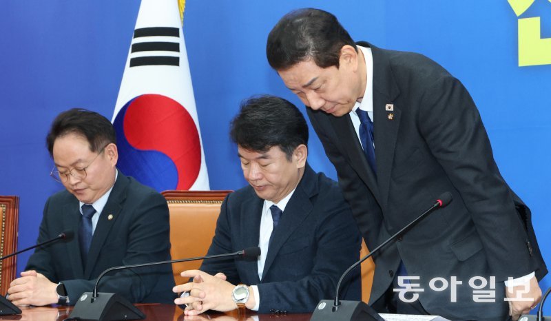 더불어민주당 김병기 원내대표(오른쪽)가 30일 오전 서울 여의도 국회에서 열린 원내대책회의에서 고개를 숙이며 사과하고 있다. 이날 김 원내대표는 “국민의 상식과 눈높이에 한참 미치지 못한 처신이 있었고 그 책임은 전적으로 제 부족함에 있다. 민주당과 이재명 정부의 걸림돌이 될 수 없다”며 사퇴했다. 이훈구 기자 ufo@donga.com