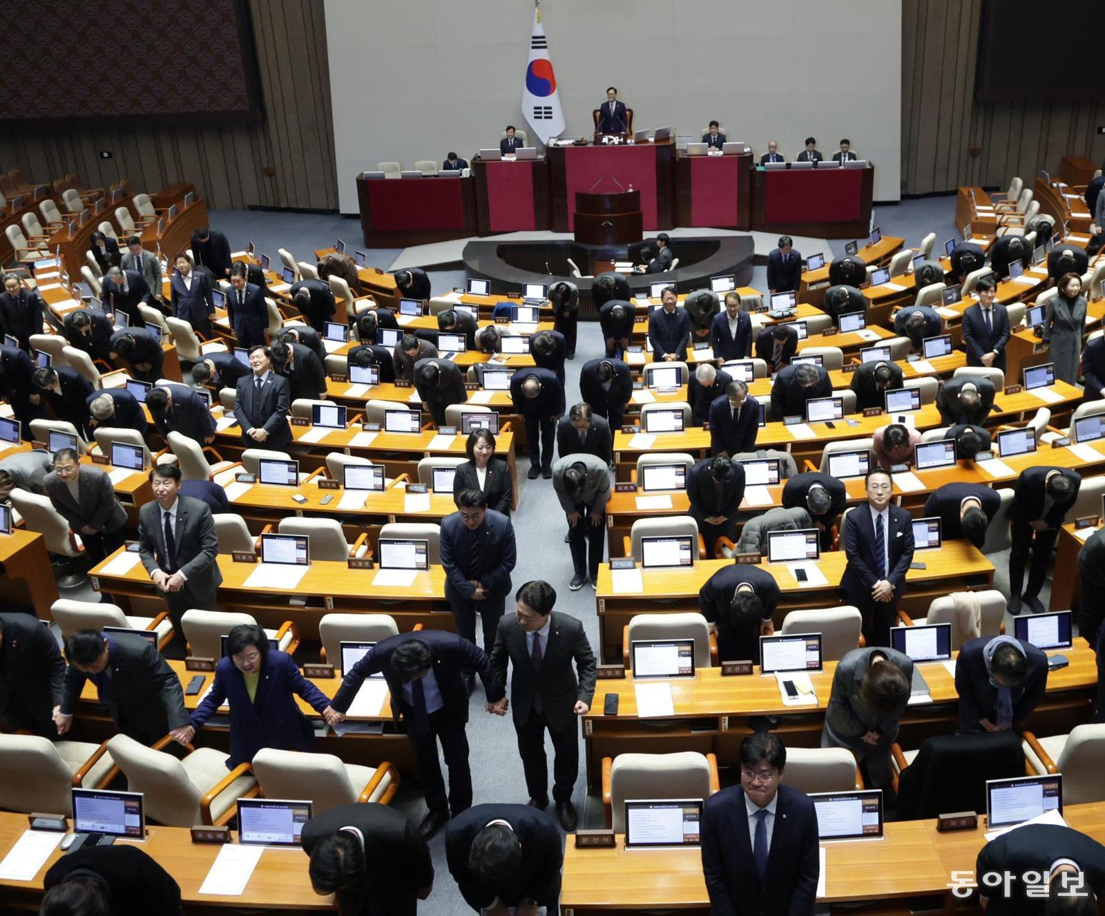 여야 의원들이 30일 서울 여의도 국회에서 올해 마지막 본회의를 마친 뒤 일제히 뒤로 돌아 허리를 숙이며 국민에게 인사하고 있다. 국회는 이날 형법 개정안 등 6개 비쟁점 법안과 김호철 감사원장 후보자에 대한 임명동의안을 처리했다.
