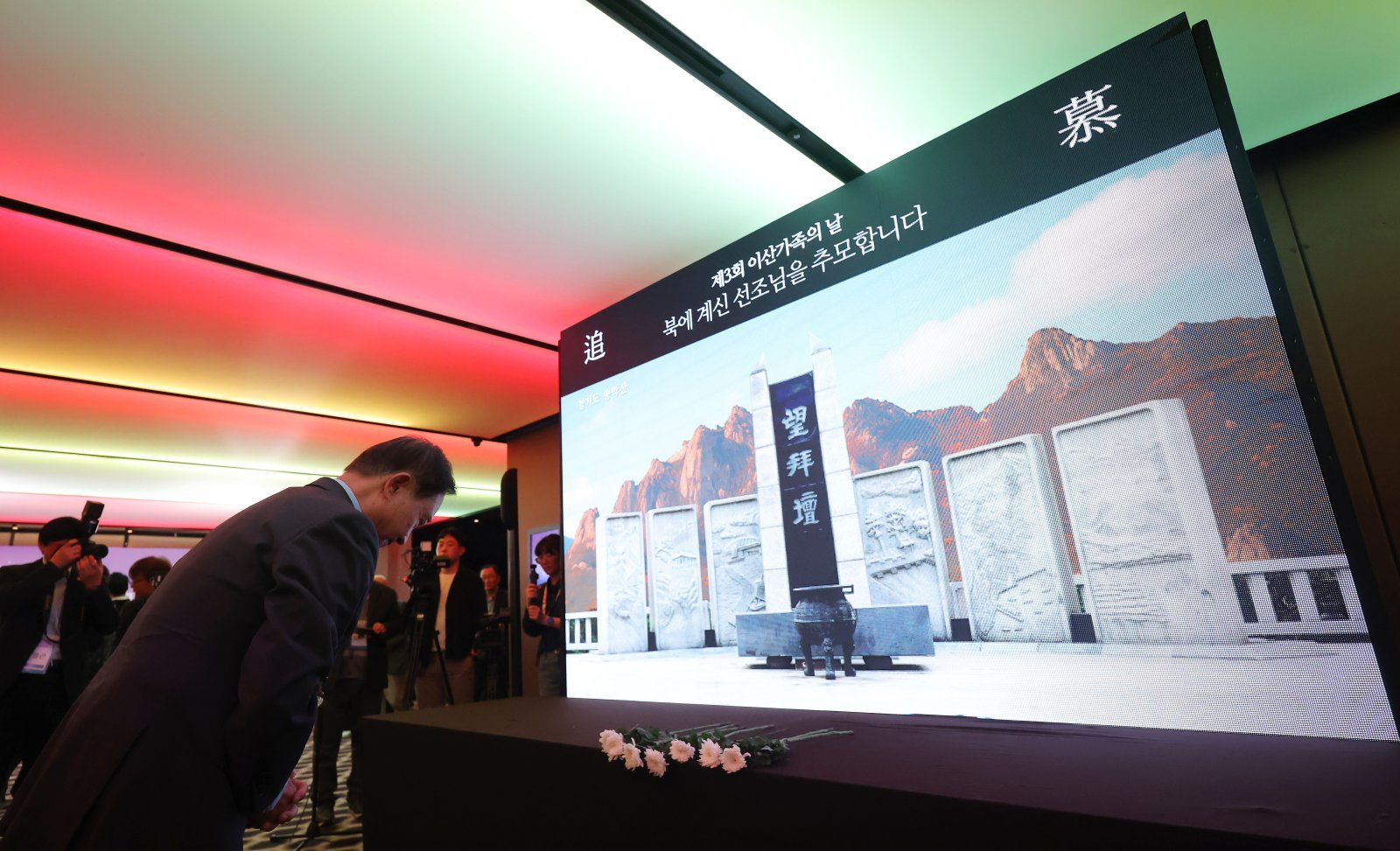4일 오전 서울 중구 더 플라자 호텔에서 열린 제3회 이산가족의 날 기념식에 앞서 한 참석자가 디지털 망배단에 북에 계신 선조들을 기리며 묵념하고 있다. 2025.10.04 뉴시스