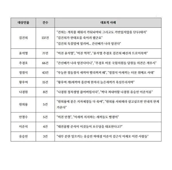 앞서 국민의힘 이호선 당무감사위원장은 이른바 ‘당원게시판 사건’ 관련 조사 결과의 일부를 공개했다. 이에 따르면 한 전 대표 측은 이 대표를 향해 “대전롬빵 준석이 이것들이 보수당을 대표한다고” 등 총 4건의 비판글을 올렸다.